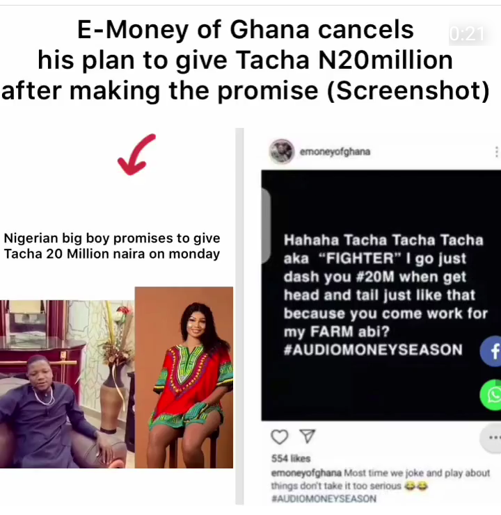 E-Money of Ghana cancels his plan to give Tacha N20million after making the promise (Screenshot) Entertainment •